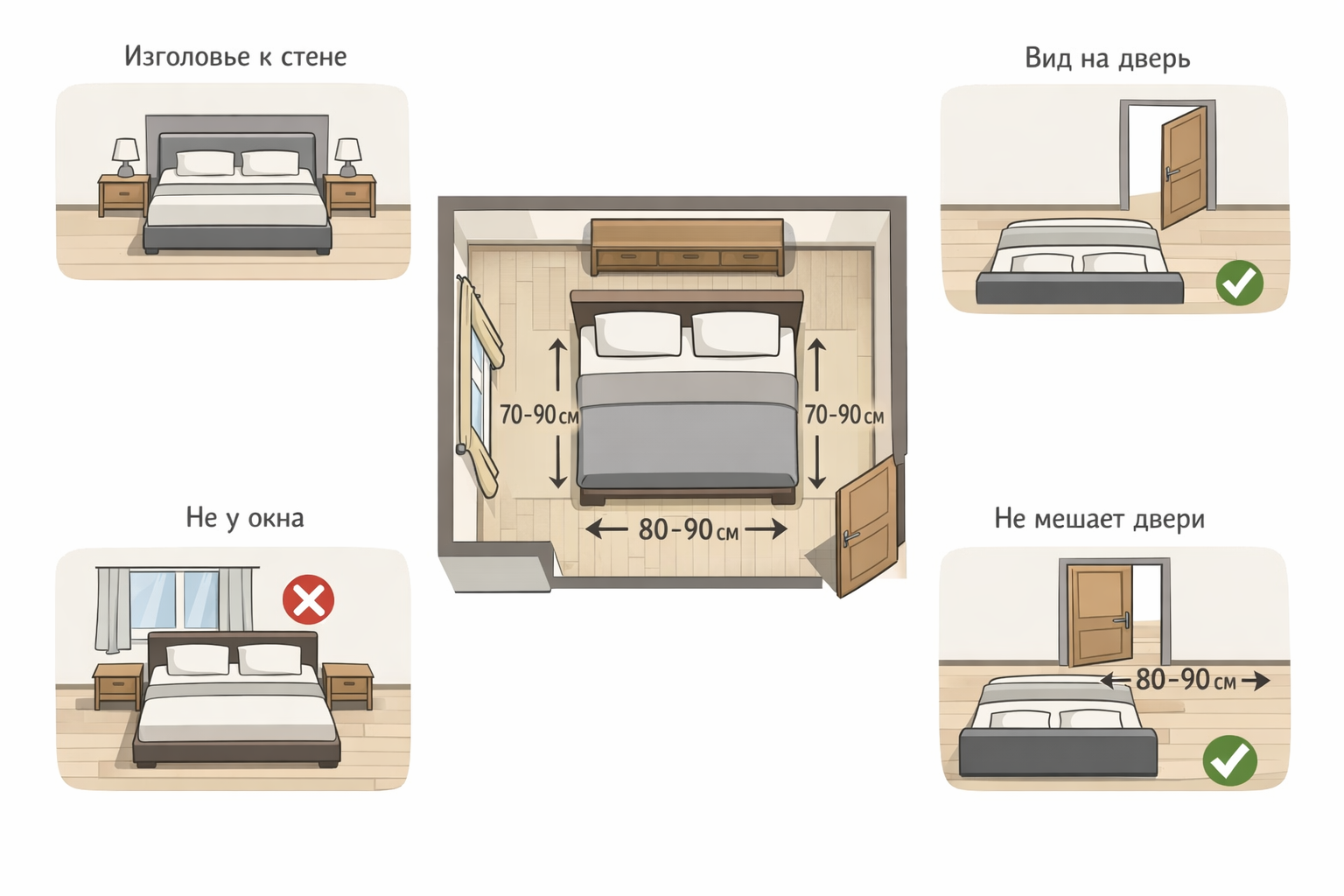 • расстояние от кровати до двери/прохода: желательно 80–90 см;